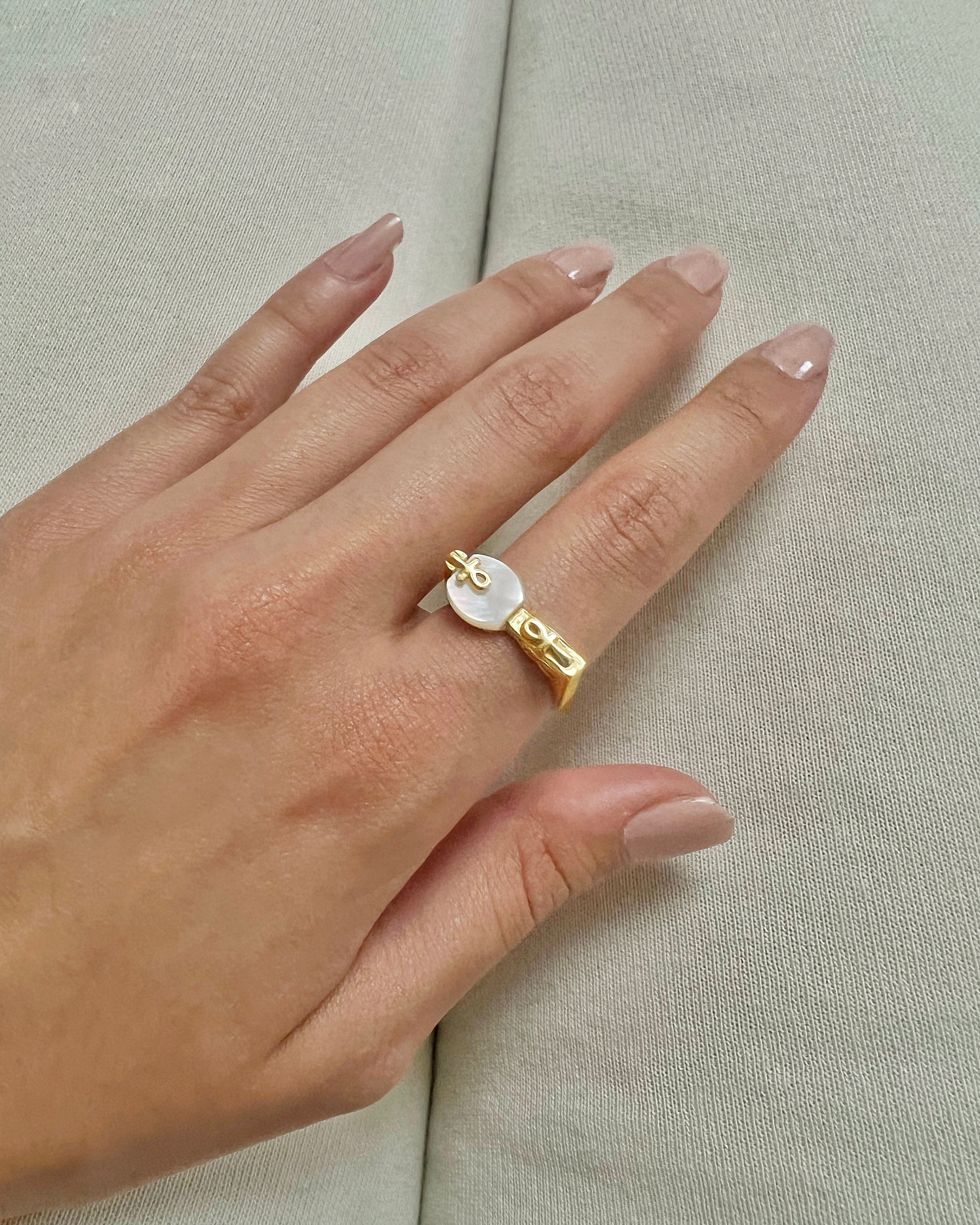 A 925k handcrafted sterling silver royal ring , with natural mother of pearl stone adorned with Gold vermeil.