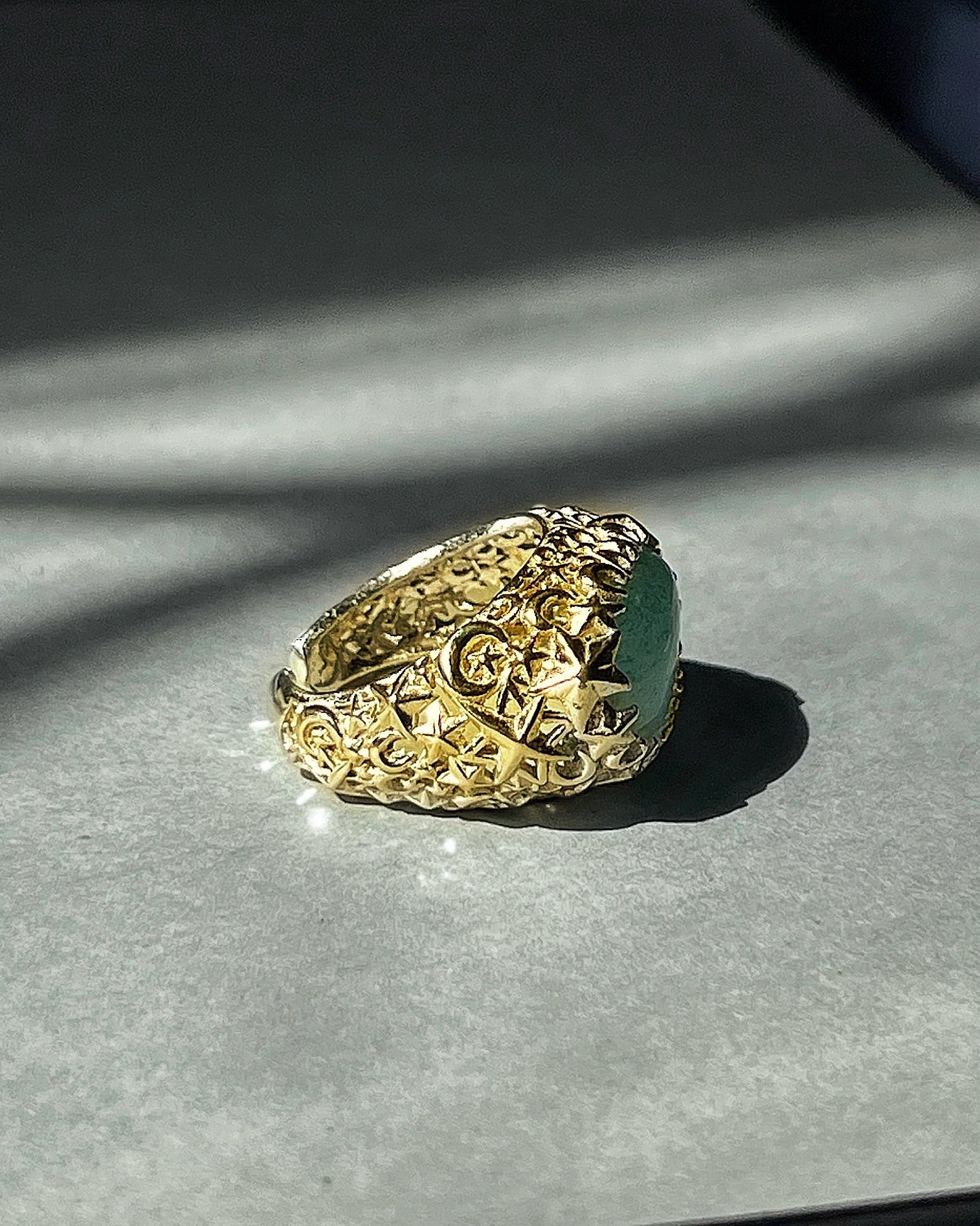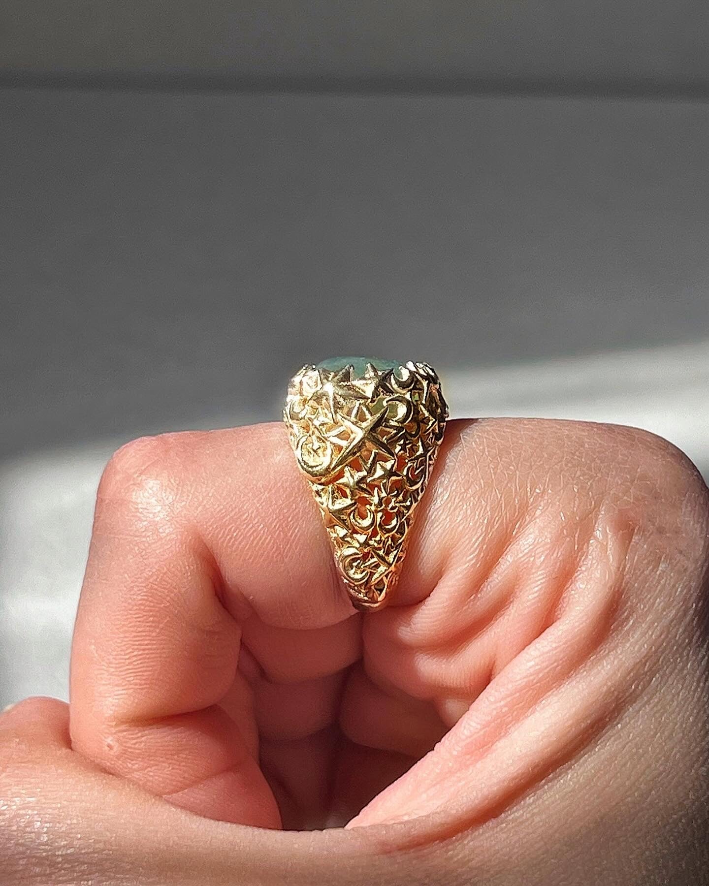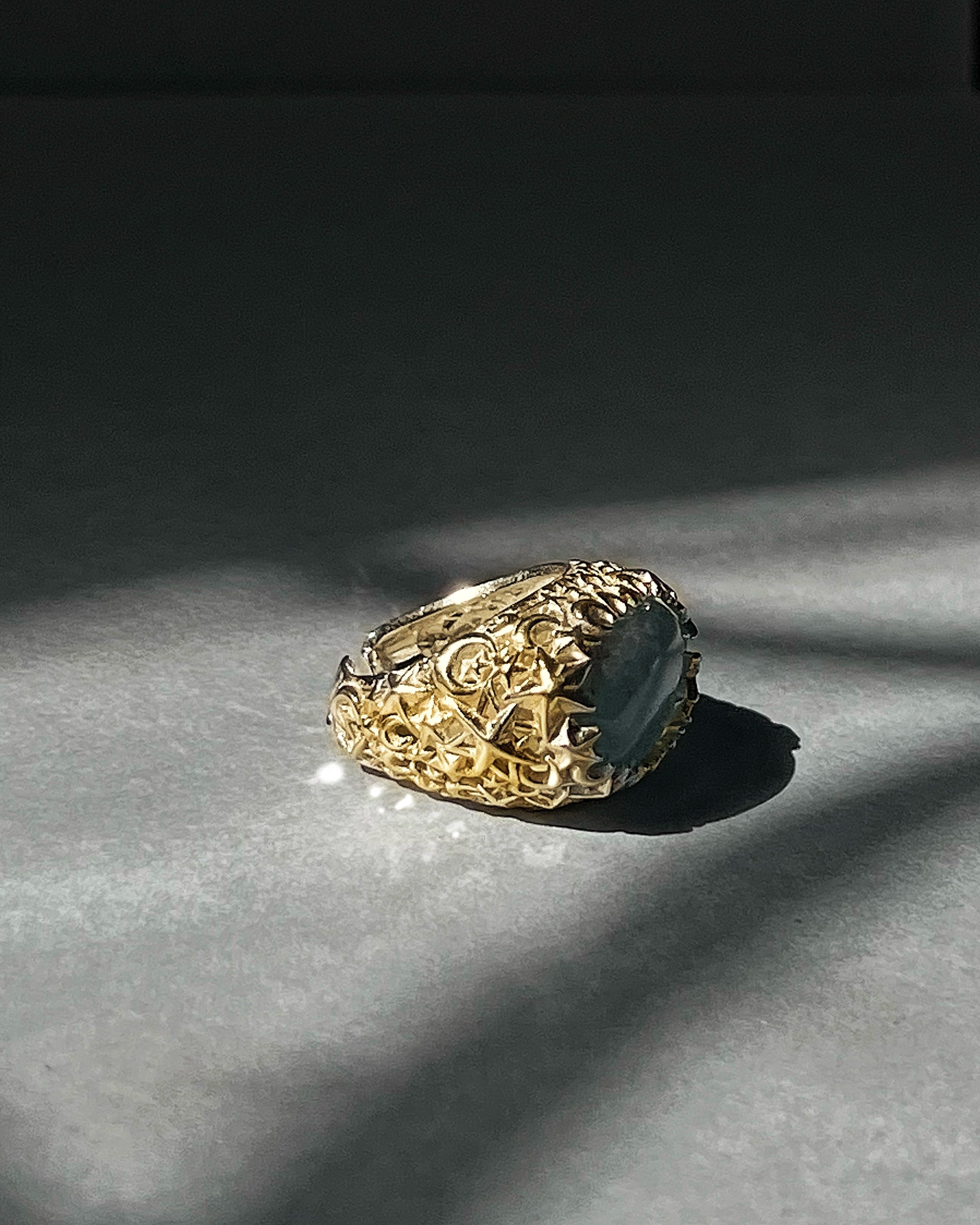 This ring brings together the luminous essence of the moon and various shapes of stars into a captivating design.